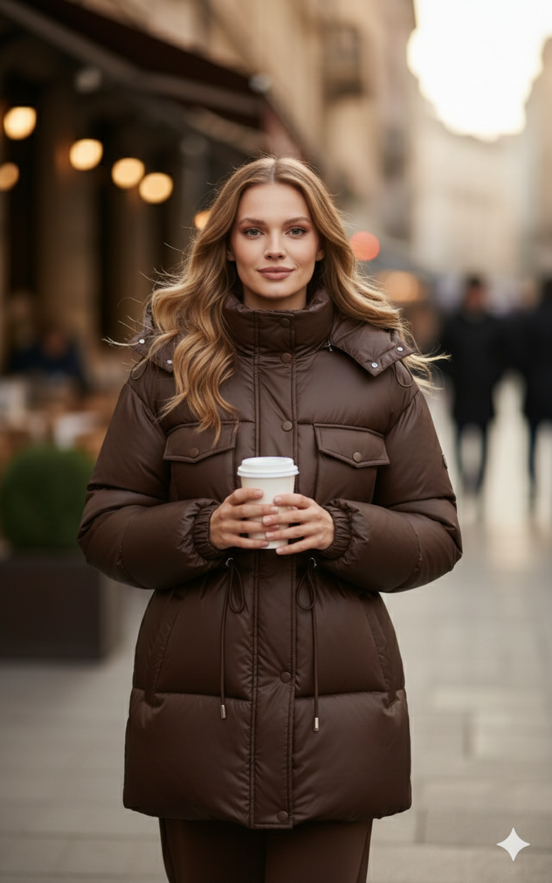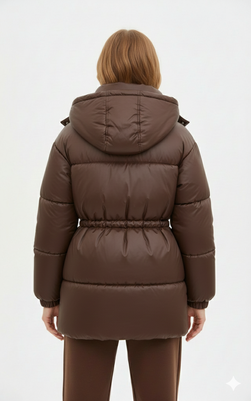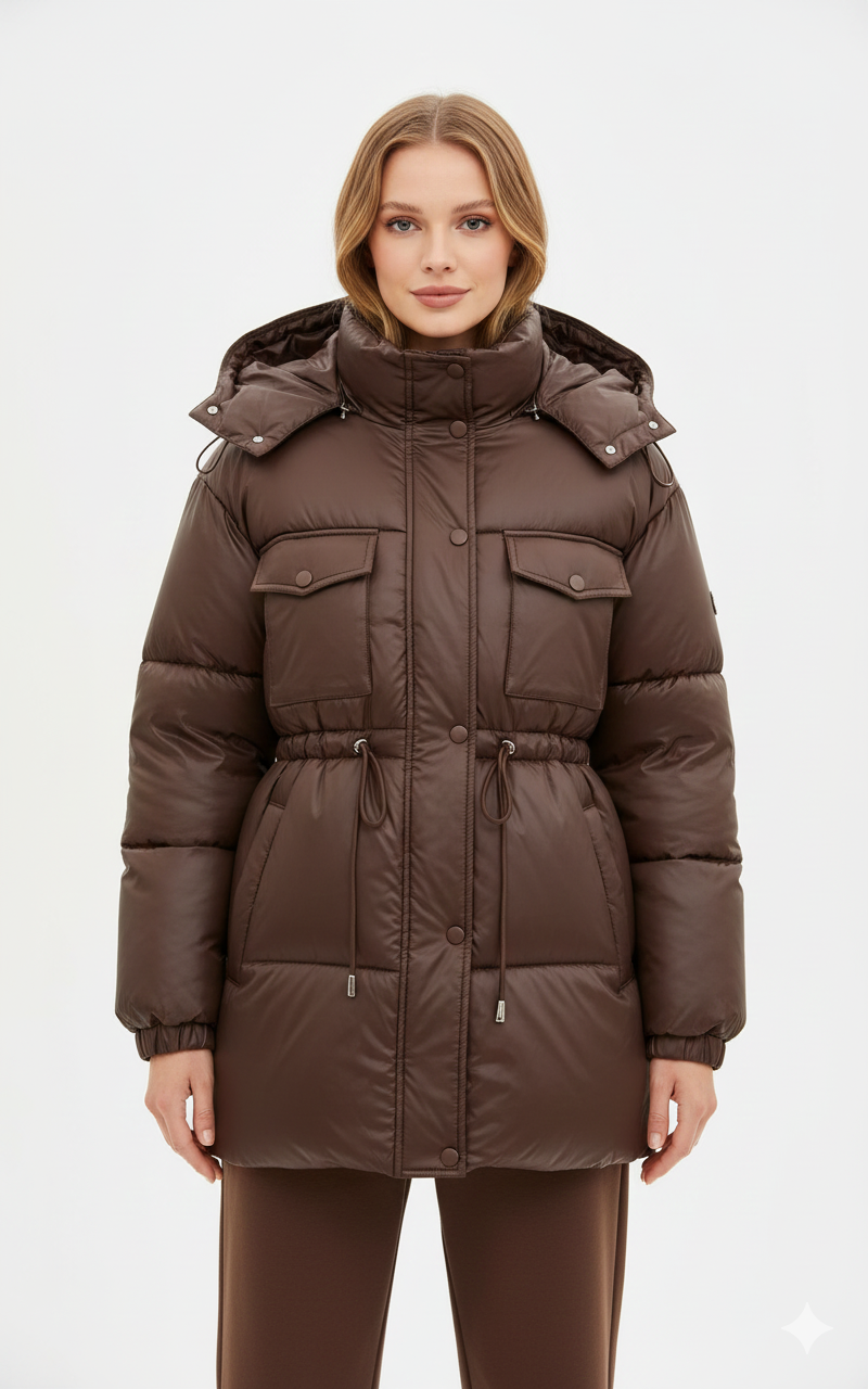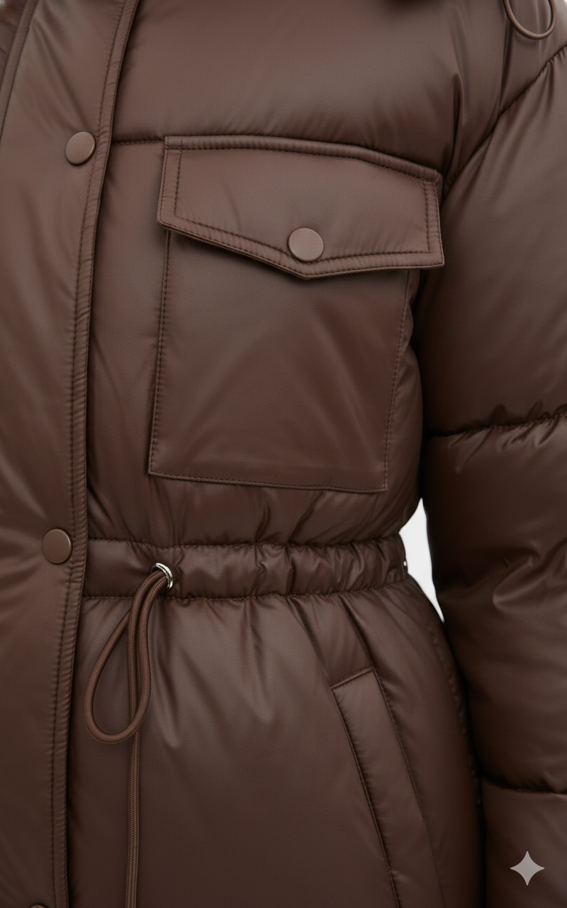 Bel Bağcıklı Çok Cepli Kapüşonlu Uzun Dolgulu Kadın Mont (Kahverengi)