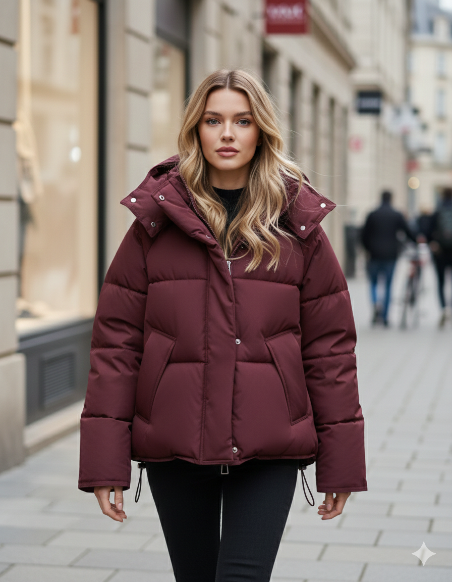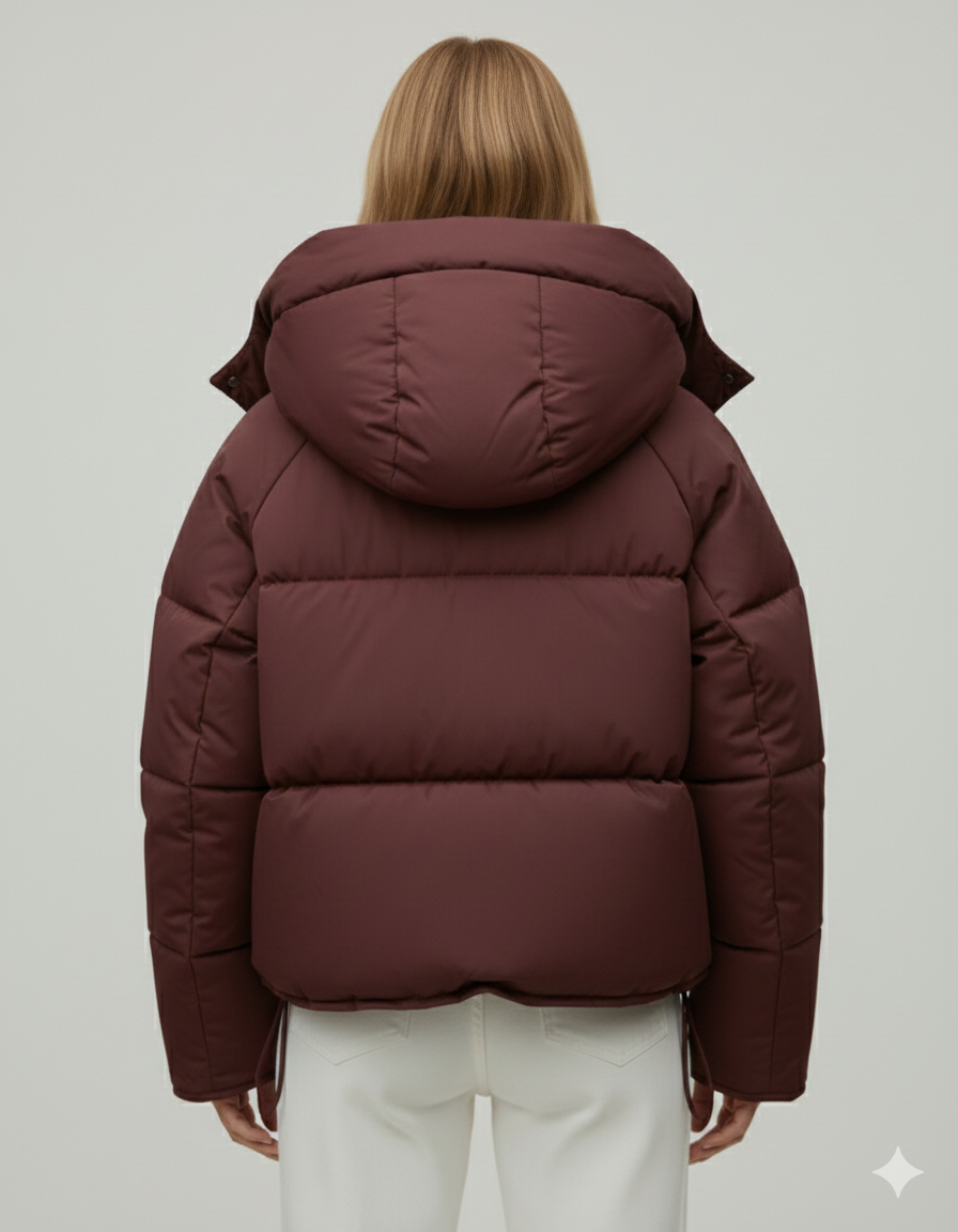 Çift Düğmeli Kapüşonlu Oversize Dolgulu Kadın Mont (Bordo)