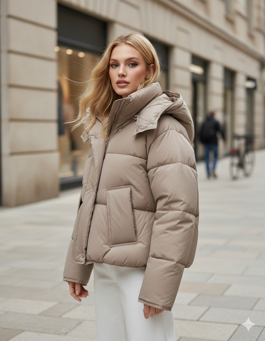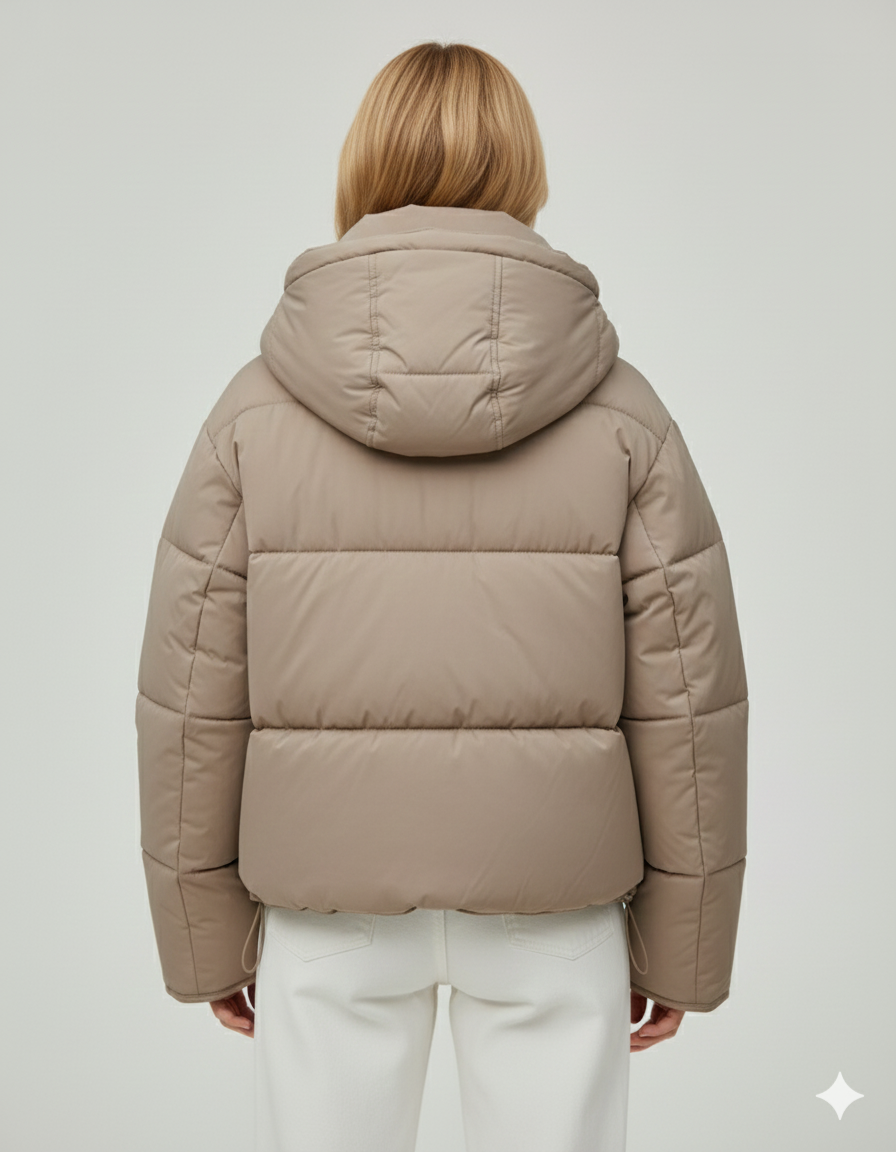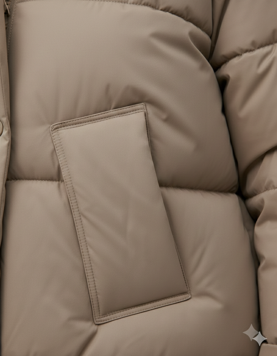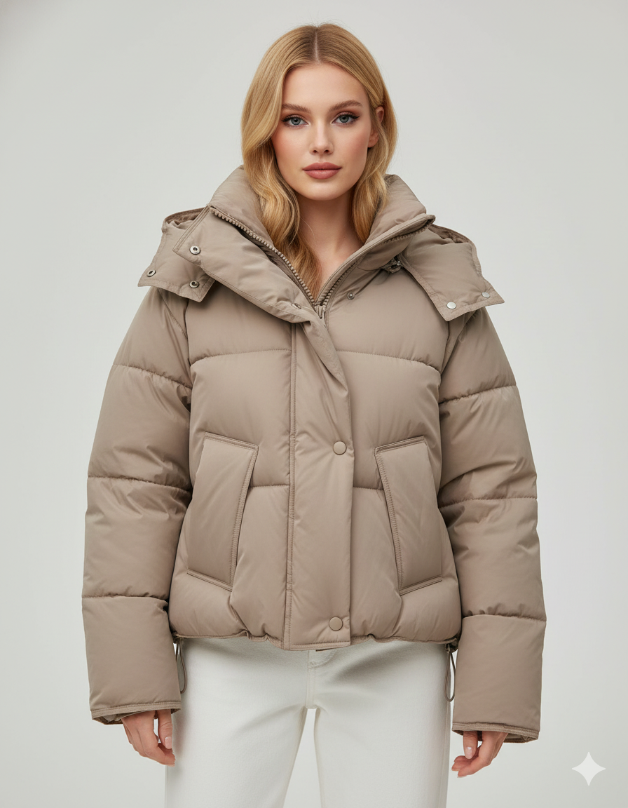 Çift Düğmeli Kapüşonlu Oversize Dolgulu Kadın Mont (Vizonsu Bej)