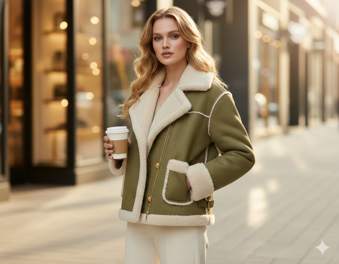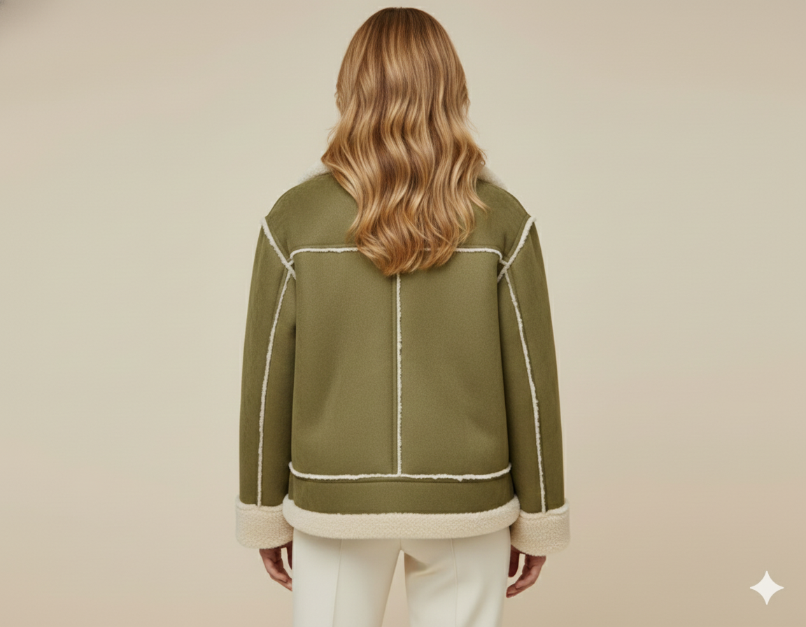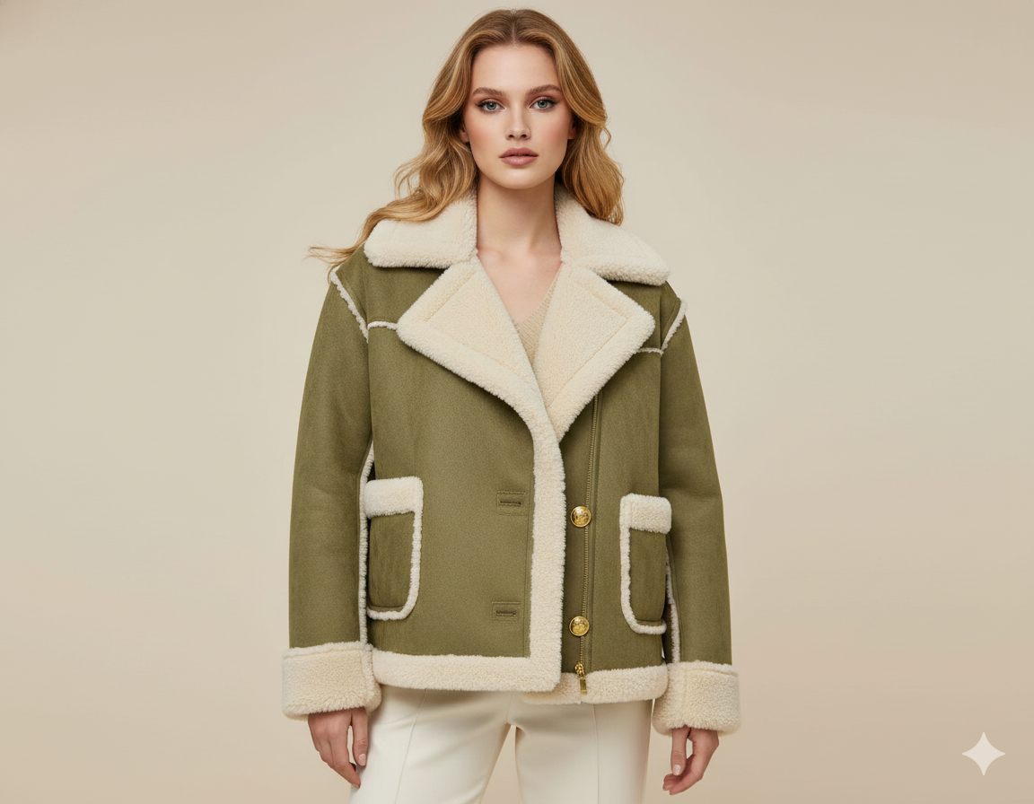 Kürk Detaylı Altın Düğmeli Shearling Ceket (Haki)